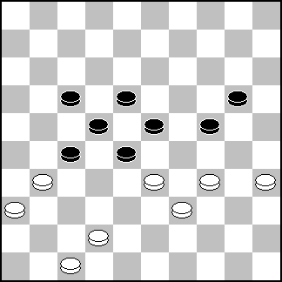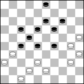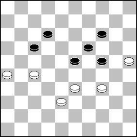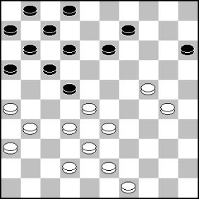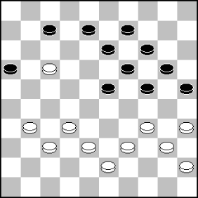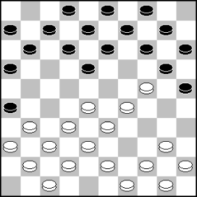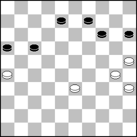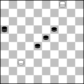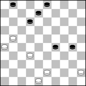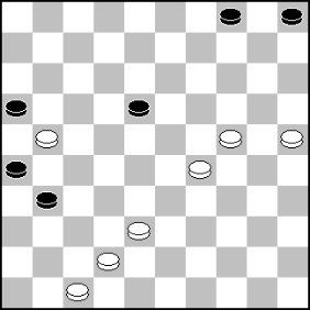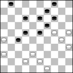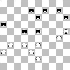 De stand ziet er tamelijk hopeloos uit voor wit. Hij koos voor: 34-30 (25×23), 33-29 (24×33), 39×19 (13×24), 37-31 (26×37), 42×13 (8×19). Na deze spectaculaire manier om een schijf te offeren, won zwart gemakkelijk.